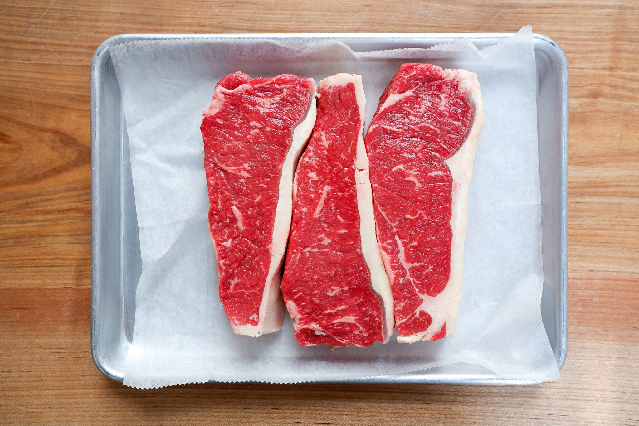 Before: Plan ahead and season your steak with salt up to a day in advance, this will allow the steak to be seasoned throughout, rather than just on the surface. When you’re ready to cook, take your steak out of the refrigerator so it can start to rise in temperature before you cook it (I recommend about an hour, and if you have’t salted it yet, now’s the time!). This results in more even cooking throughout, as opposed to a done exterior and rare center, when the middle of your steak isn’t ice cold to start. And finally, take care to pat the steak dry before you place it in your hot skillet to remove as much moisture as possible, this will give you the most efficient browning.